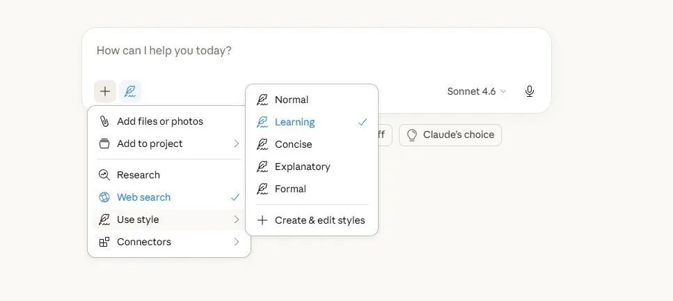 在网页或应用中打开 Claude,开始对话,选择'学习风格'。 然后提问或上传文档,Claude 接管一切,无需设置、无需插件,引导你理解概念。