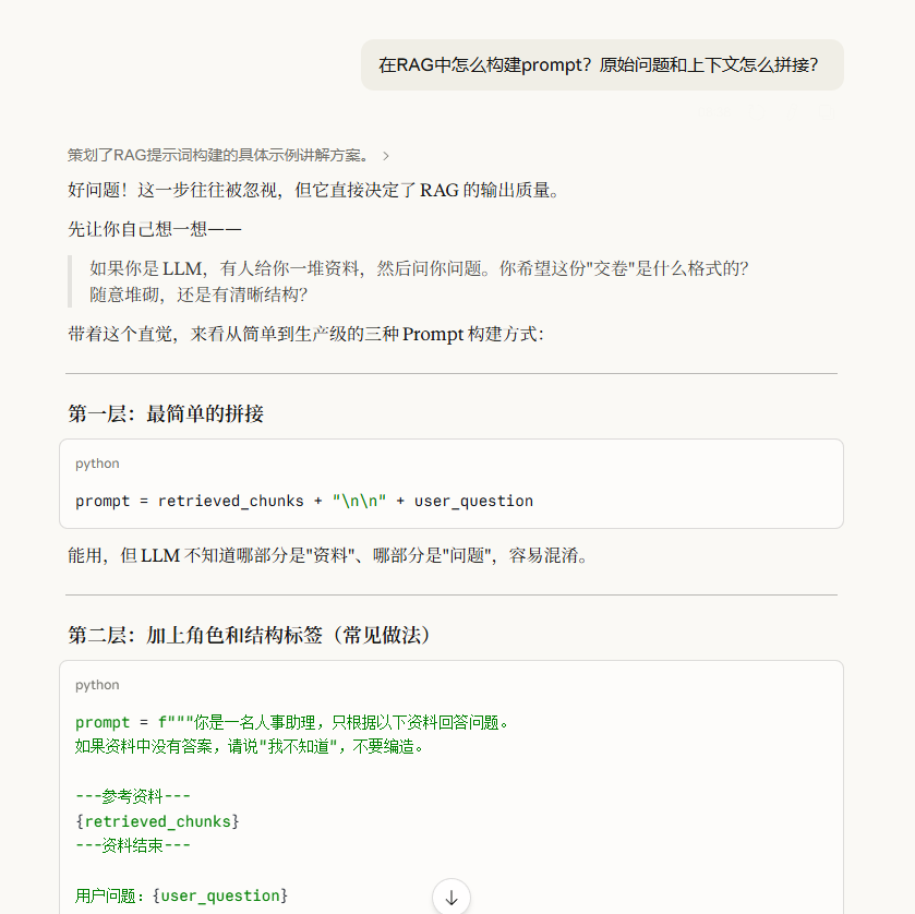 这个图是逐步动态展示的,生成完成后,如果你对于图中具体的步骤节点不懂,可以直接点击节点。比如我点击了【拼接成Prompt】这个节点,Claude会自动提问。