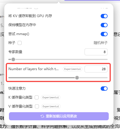 3 把“Number of layers for which to force MoE weights onto CPU”参数调到20-35左右,这个参数越大,模型加载到内存的部分越大,也就是显存需求就越少。看自身电脑显存和内存的配置来调整。