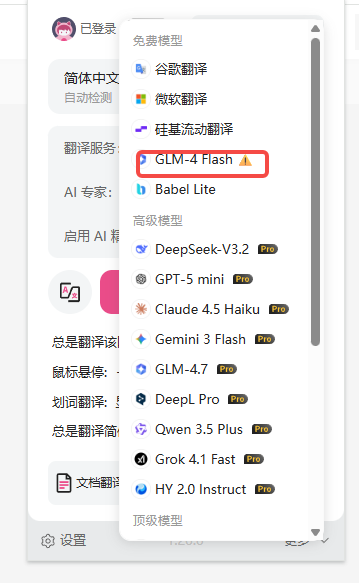 安装好后,点击右上角图标,翻译服务,可以选择GLM-4 Flash,效果很好,一般使用就够了,那么如果像下面这样出现感叹号,就是使用过度限流了。