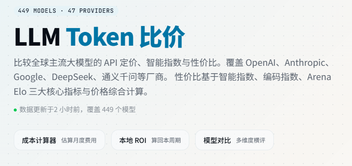 打开 token.kuhung.me,你会看到一张覆盖 449 个模型、47 家厂商 的大表。每个模型的输入价格、输出价格、上下文长度、智能指数、编码指数、Arena Elo 排名,全部清清楚楚摆在面前。