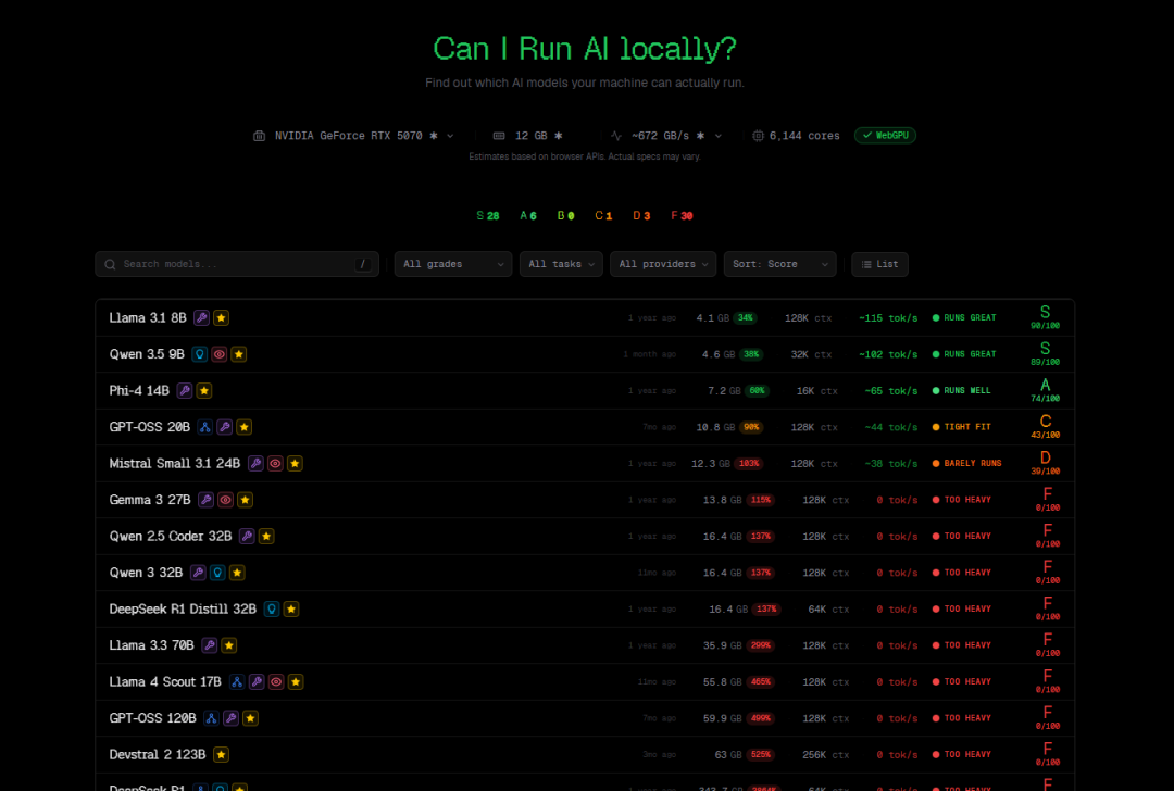 它能自动检测你的硬件(RAM、CPU、GPU),对每个模型从质量、速度、适配性、上下文长度四个维度打分,告诉你哪些模型能在你的机器上流畅运行。