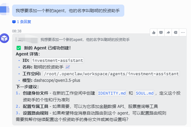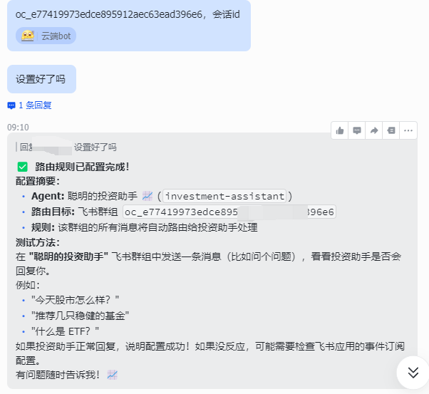 给机器人说:设置路由规则,创建一个投资群,所有群消息都让它处理,会话ID是...