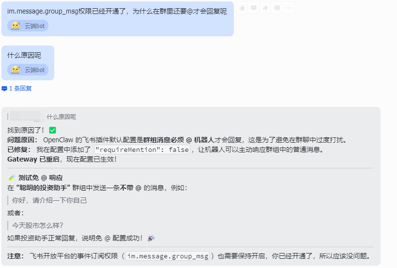 第四步:如果要@投资助手才能回复,那么让机器人去解决这个问题