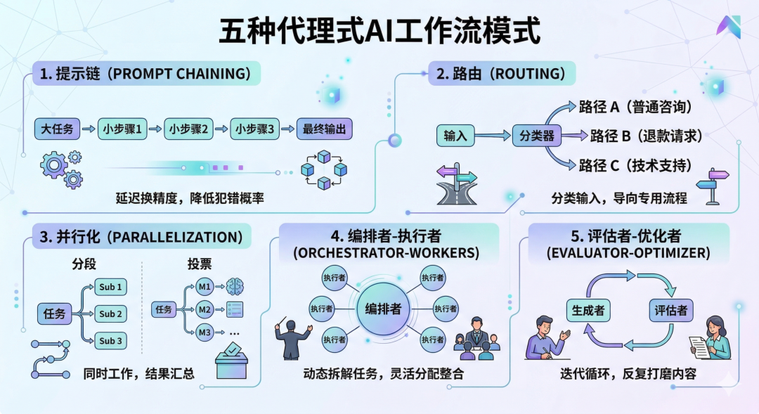 文章的核心内容是五种经过生产验证的工作流模式,从简单到复杂依次递进: