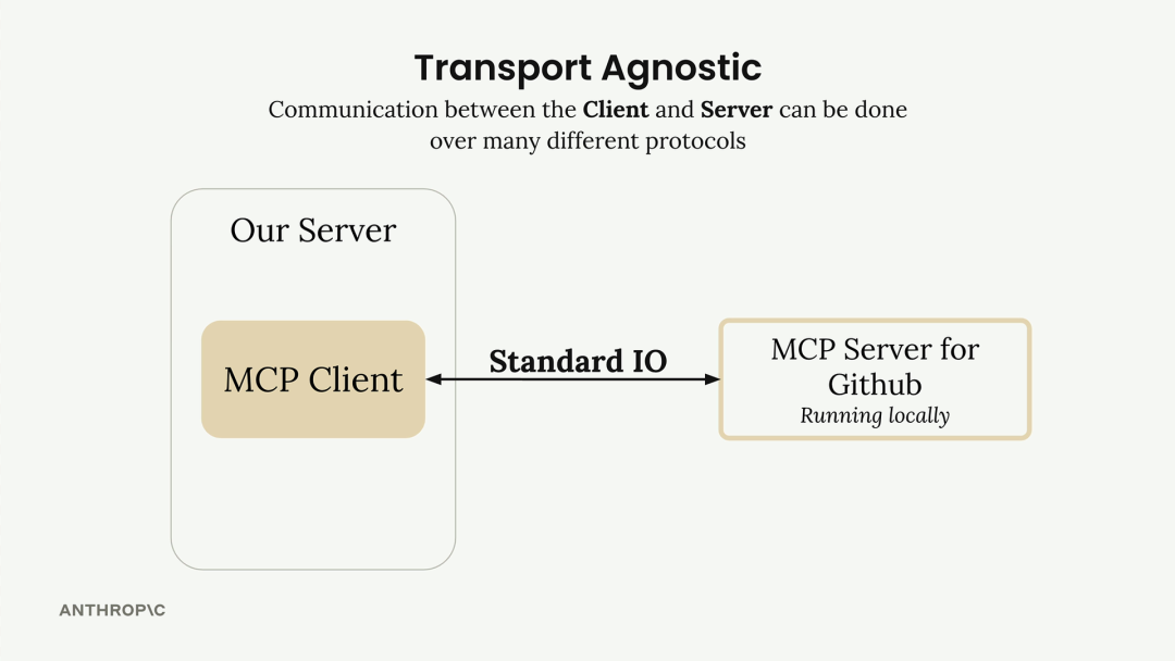 最常见的方式,是 MCP Client 和 MCP Server 跑在同一台机器上,通过标准输入输出(stdin/stdout)直接通信,简单高效。