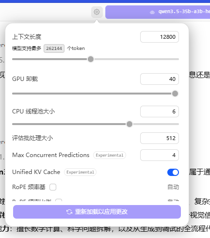 3 把“Number of layers for which to force MoE weights onto CPU”参数调到20-35左右,这个参数越大,模型加载到内存的部分越大,也就是显存需求就越少。看自身电脑显存和内存的配置来调整。