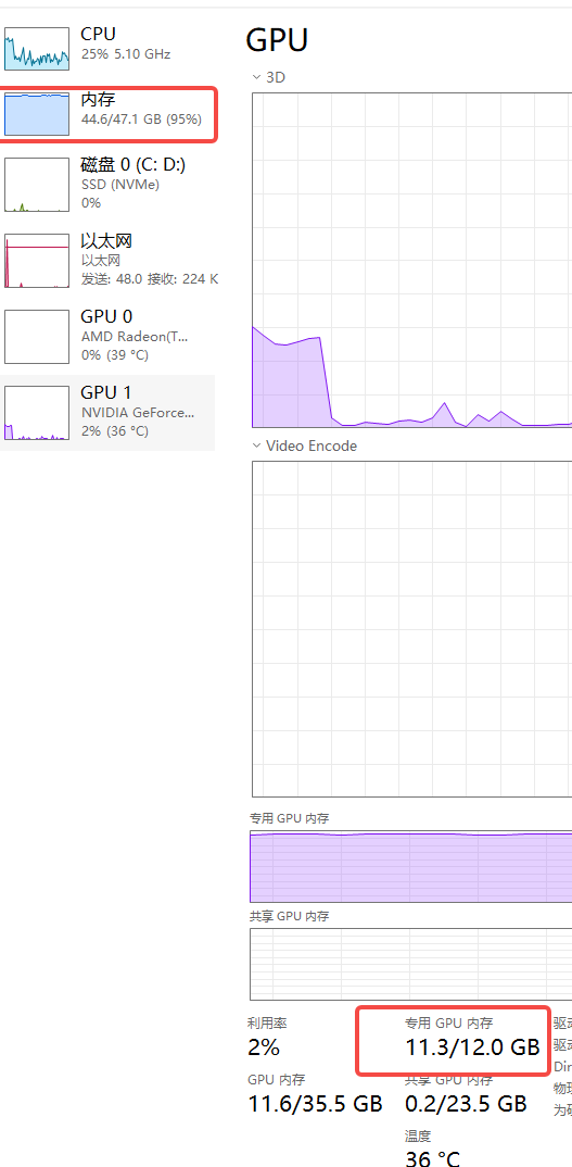 我的电脑配置是12G显存和48G内存,这个参数设置28,内存占用44.6G,显存占用11.3G,基本达到极限了。