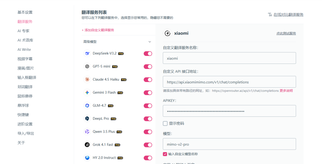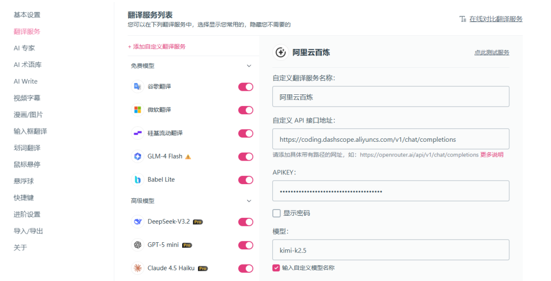 翻译服务,添加自定义翻译服务,填入API接口地址: