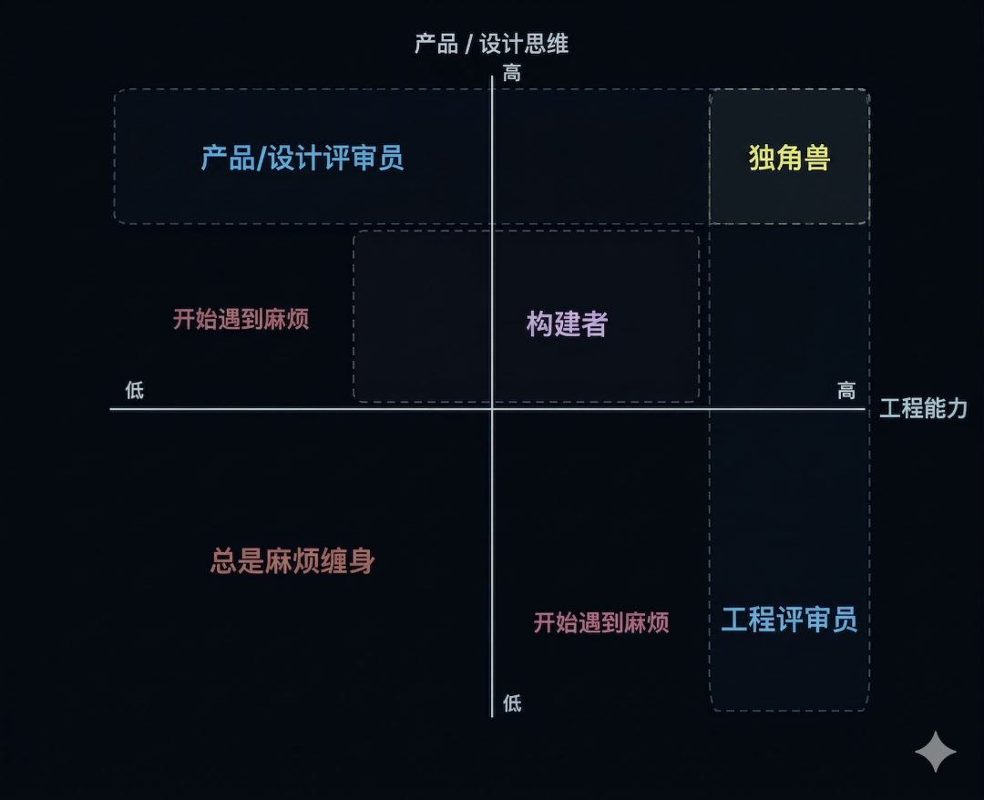 第二种是"审查者":在某个领域拥有极深的系统思维能力,能够快速、高质量地评审大量涌入的原型和代码。他们是质量的最后防线。