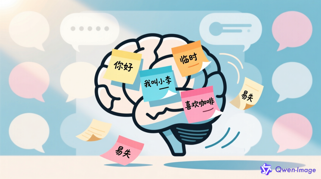- 短期记忆:像“临时便签”,只在当前对话里有效