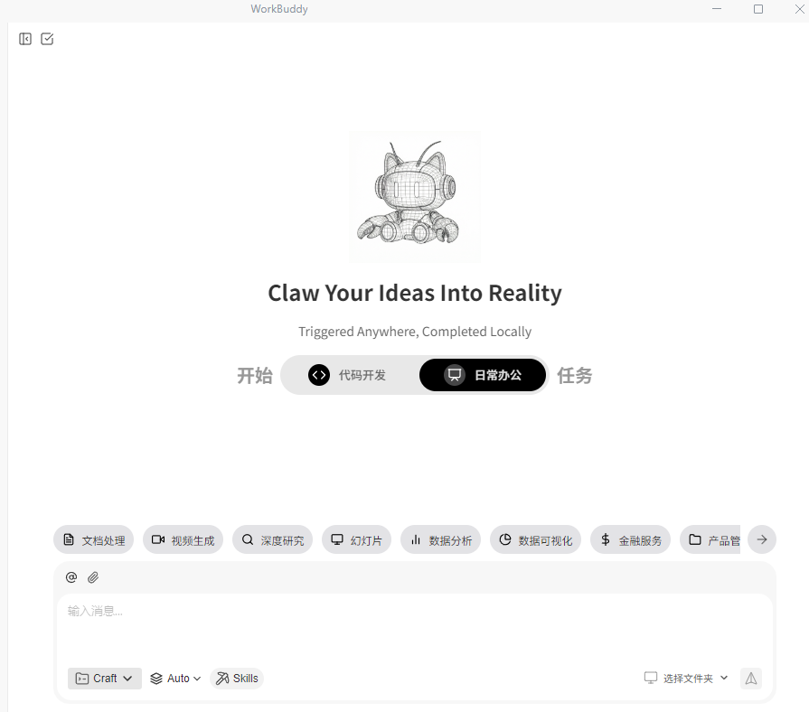 WorkBuddy 的界面设计非常直觉,主要分为三个区域: