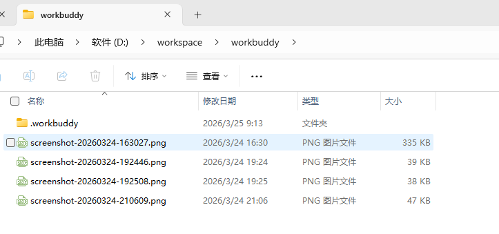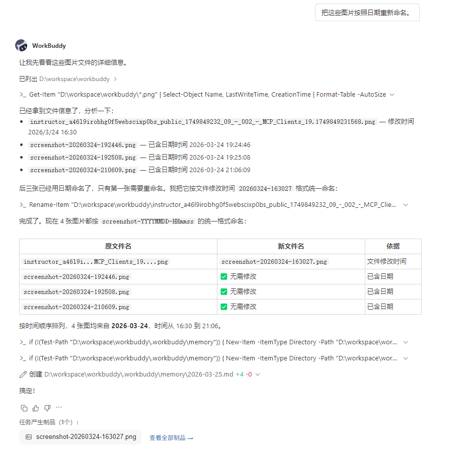 WorkBuddy自动识别到我有三张图片已经包含时间了,所以它按照这三张图片的格式重新命名了第四张图片,这期间我没有明确要求它这么命名。